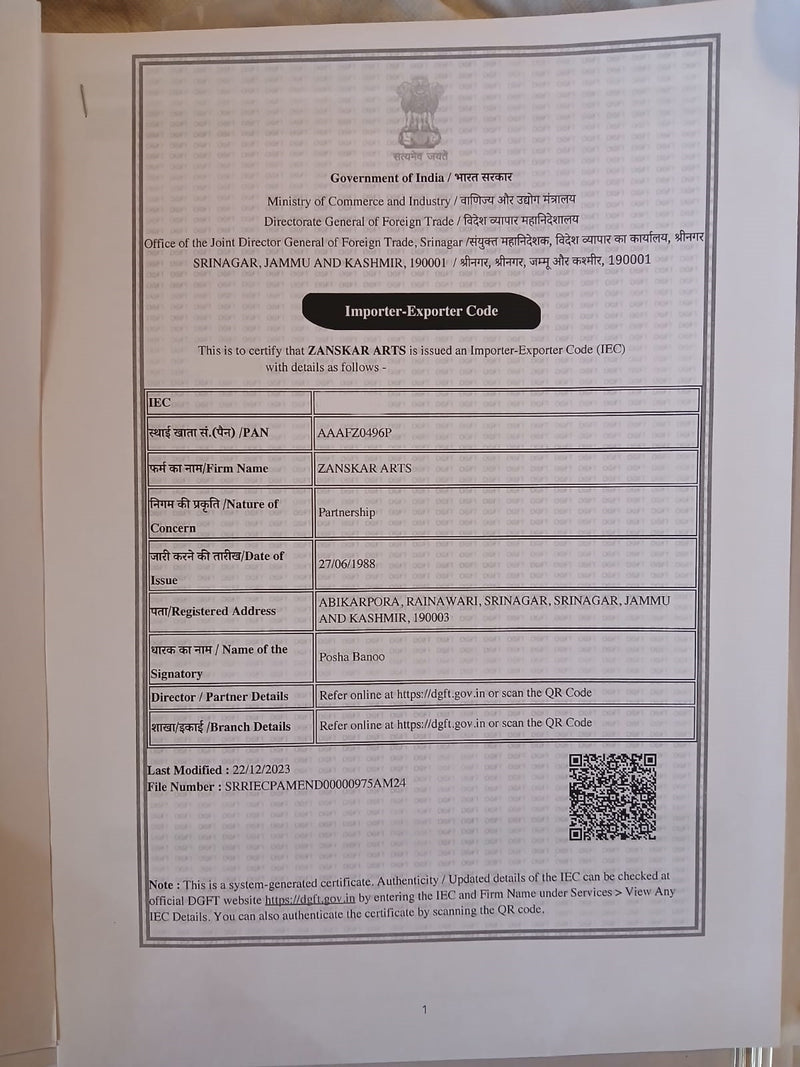 Zanskar Arts is a prominent retail and e-commerce business specialising in traditional Kashmiri and Ladakhi handicrafts, including Pashmina shawls, silk and woollen carpets, jewelry, and various home furnishings. Established in 1982 by Mr. Bashir Ahmad Razaki, the company has its roots in Leh, Ladakh, India.